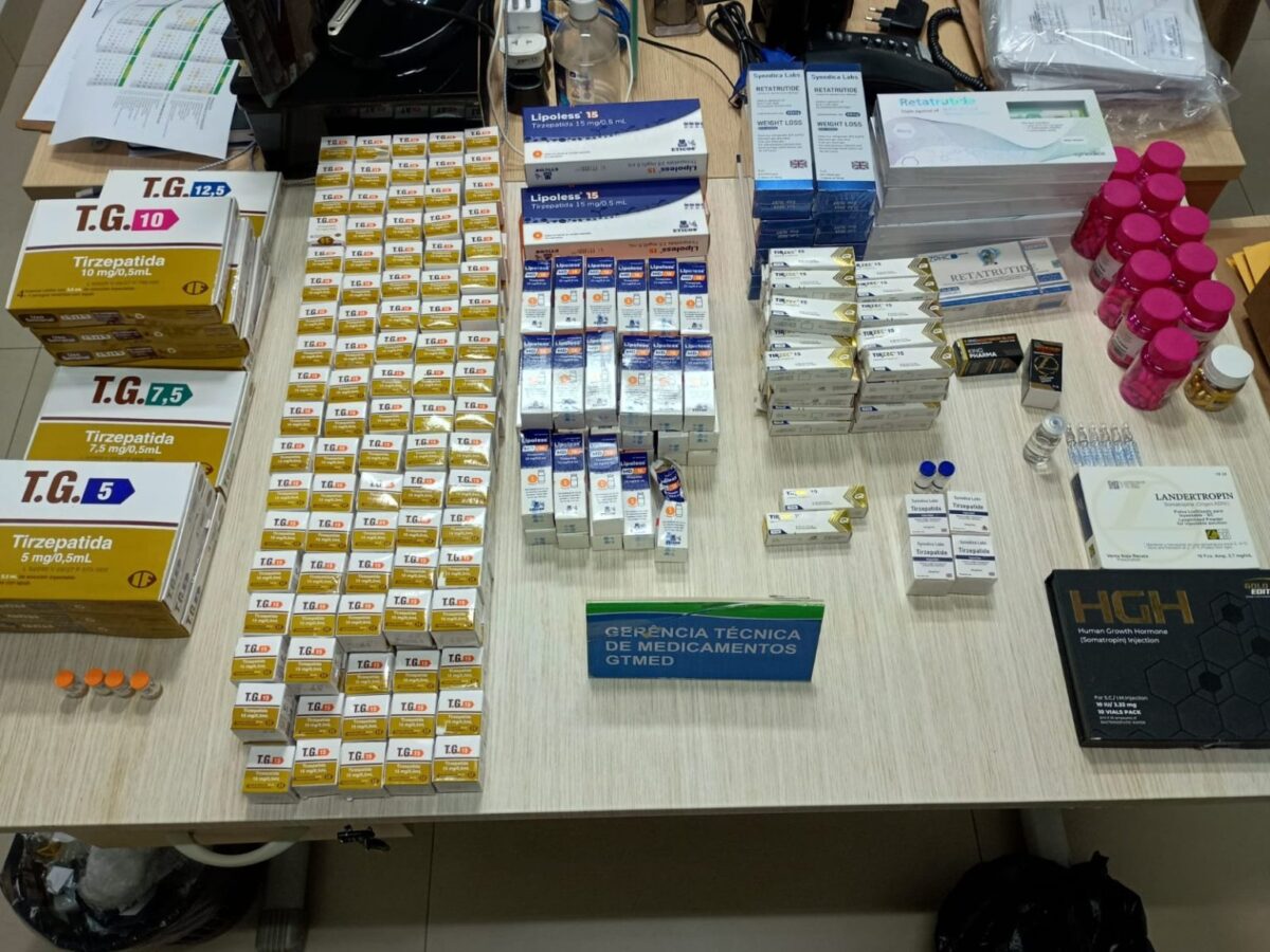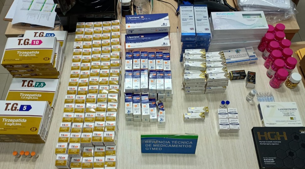 Entre os itens apreendidos estavam 3.168 ampolas de tirzepatida, 78 canetas de retratutida, além de semaglutida, somatropina, esteroides anabolizantes, toxina botulínica, oxandrolona, lisdexanfetamina e suplementos alimentares, todos sem comprovação de registro, procedência ou autorização sanitária.