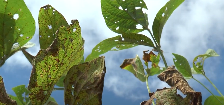 A ferrugem asiática, causada pelo fungo Phakopsora pachyrhizi, manifesta-se inicialmente em forma de pequenas lesões marrom-avermelhadas na face inferior das folhas. À medida que a infecção progride, os pontos tornam-se mais escurecidos e se espalham por toda a superfície foliar, reduzindo a área fotossintética, provocando necrose e levando à desfolha precoce. Em situações severas, a doença pode comprometer até 90% da produção se não for controlada adequadamente.