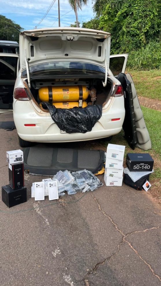 No interior do Fiat Siena, os policiais localizaram 90 iPhones usados de diversos modelos, além de nove aparelhos novos do modelo iPhone 17 e quatro unidades do modelo 17 Pro Max. Também foram encontrados equipamentos fotográficos, entre eles quatro lentes da marca Tamron, duas lentes Lumix, uma lente Fujifilm e um microfone modelo Lark M2.