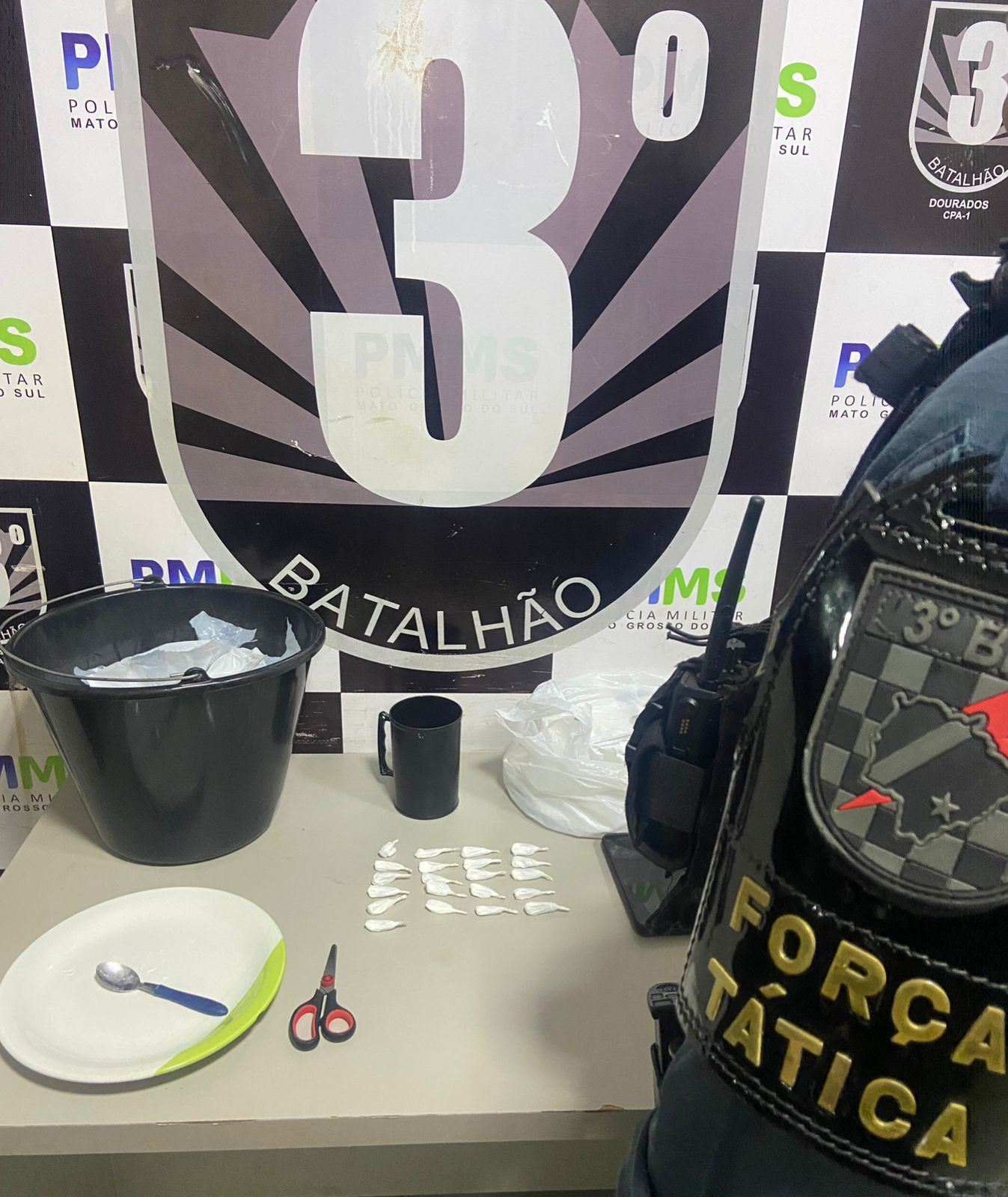 Durante a averiguação no imóvel, os agentes localizaram sobre uma mesa 20 porções de cocaína, acondicionadas em um copo, além de um prato com resquícios da droga, uma colher utilizada para o fracionamento, sacos plásticos e uma tesoura. Também foi apreendido um aparelho celular da marca Samsung, pertencente à suspeita.