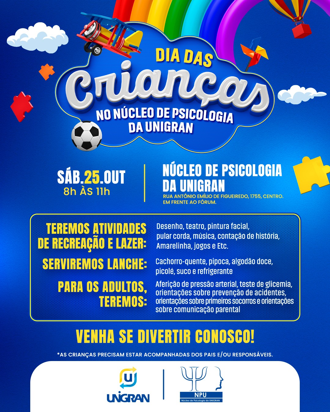 O Núcleo de Psicologia da UNIGRAN realizará, no próximo sábado, 25 de outubro, das 8h às 11h, uma programação especial em comemoração ao Dia das Crianças. O evento, gratuito e aberto à comunidade, será realizado na Rua Antônio Emílio de Figueiredo, 1755, em frente ao Fórum, e reunirá atividades recreativas, orientações de saúde e ações educativas que fortalecem os vínculos familiares e comunitários.