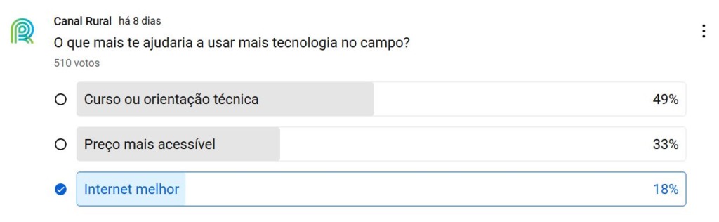 Segundo os resultados, 49% dos participantes acreditam que cursos ou orientação técnica são o que mais ajudaria na adoção de tecnologia no campo. Já 33% apontaram o preço mais acessível como fator determinante, enquanto 18% destacaram a necessidade de internet melhor.