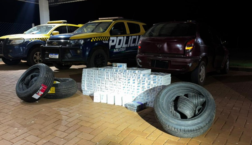 Durante fiscalização de trânsito e combate a crimes transfronteiriços, equipe da Polícia Militar Rodoviária, da Base Maracaju, abordou um veículo Celta na rodovia MS-164, km 1. Durante a vistoria, os policiais encontraram várias mercadorias de origem estrangeira sem documentação fiscal. Foram apreendidos 20 pneus de medidas diversas, 200 pacotes de cigarros das marcas Fox e Palermo, 100 baterias de iPhone 11 Pro e 50 baterias de modelo A54.